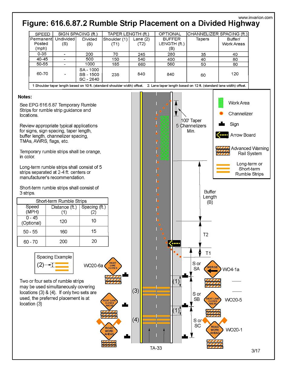 m 616.6.87 Temporary Rumble Strips (MUTCD 6F.87): Per CM, revised two location notes and the color of the rumbles in the legend to aid designers in completing temporary traffic control plans.