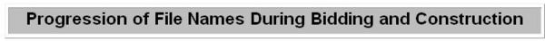 The file name for all revised sheets for the first change order shall contain a _C001 at the end of the | The file name for all revised sheets for the first bridge change order shall contain a _C001 at the end of the final contract plan file name; the second bridge change order shall contain a _C002; etc. The signed and sealed revised plan sheets shall be saved to the appropriate contract plans folder in ProjectWise. The following example shows the progression of file names for plan sheets during bidding and construction. | ||