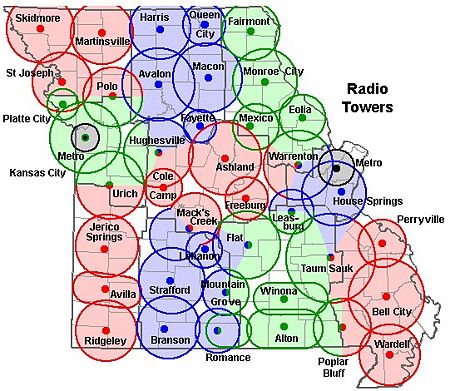 The system is a high band mobile relay radio composed of a number of land stations and mobile units. Eight frequencies are used in the system. Separate transmit and receive frequencies are assigned to each of three Channels A, B or C. The seventh frequency, along with the mobile radio transmit frequency assigned to Channel A, form the St. Louis metro channel. Likewise, the eighth frequency, along with the mobile radio transmit frequency assigned to Channel B, form the Kansas City metro channel.