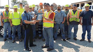 |colspan="2"|[[image:Main Page Sept 6, 2012.jpg|390px|center|thumb|<center>'''Sgt. Mike Quilty presents an award to Maintenance Supervisor Mike Lewis and the | |colspan="2"|[[image:Main Page Sept 6, 2012.jpg|390px|center|thumb|<center>'''Sgt. Mike Quilty presents an award to Maintenance Supervisor Mike Lewis and the Mound City Maintenance Facility crew. First Row, l-r: Ed Hunziger, Chris Davison, Bret Bailey, Dusty Herron, Darin Meyer, Tim Hays. Second Row, l-r: J.R. Rother, Blake Nauman, Wayne Markt, Allan Markt, Bill Gallagher, Cody Moyer. (Not pictured: Donald Medsker, Bill Keiffer.) The plaque thanked the crew for their hard work to help locate and recover the body of Trooper Fred Guthrie during last year's flood. Guthrie was recovered Jan. 12, 2012 after several months of searching.'''</center>]] | ||