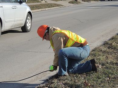Intermed. Field Acquisition Technician Joe Horan sets a road tube in Hannibal to perform a traffic count. A road tube is one of the most accurate and economical methods to collect traffic counts.
