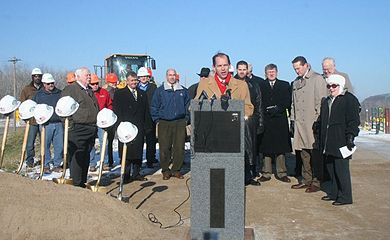 Dignitaries, including St. Louis District Engineer Ed Hassinger, break ground on a new $110.9 million Missouri River bridge between St. Charles and St. Louis counties. The I-64 bridge is being built upstream of the existing two river crossings and, when it is complete in late 2015, will replace the original 1935 bridge.