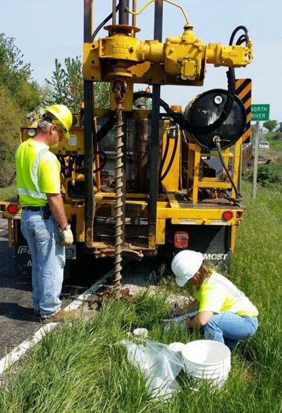 |colspan="2" | [[image:Main Page May 11, 2015.jpg|center| | |colspan="2" | [[image:Main Page May 11, 2015.jpg|center|400px|thumb|<center>''' Core Drill Assistant Gary Degraffenreid and Sr. Geotechnical Specialist Lydia Brownell gather core sample information near bridge ends. This will be used to provide slope recommendations and the soil results used to design bridge replacements. ''' </center>]] | ||