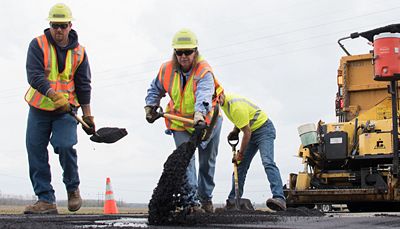 (L to R) Maintc. Supervisor Eric Kaiser and Sr. Maintc. Workers Janet Zuroweste and Jim Mengwasser are part of the crew performing an asphalt overlay near Chamois.
