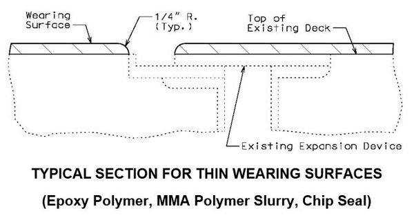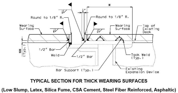 When a thick wearing surface (low slump, latex, silica fume, CSA cement, steel fiber reinforced, asphaltic) is used, the elastomeric joint must be replace by another type of expansion joint system.