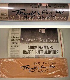 During the heavy snows of early February, District 1 Construction Project Office Assistant Lana Allen noticed a message written on the St. Joseph News-Press's protective plastic wrapping. She shared with all of us her grateful newspaper carrier's note.