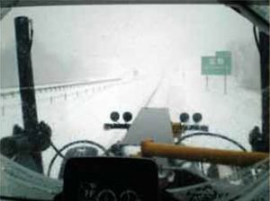 Kenneth Strube's view of I-70 from inside a motorgrader on Feb. 1, plowing through 18 in. of snow. Strube is a District 5 Maintenance Superintendent.