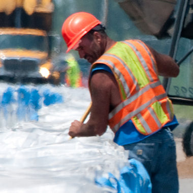 Jeff Lewis, Maintenance Supervisor in the NW District, works in the heat installing Big Bags (large sand bags with 15' long x 3' x 3' compartments) along Rte. 65 in Carroll County to hold back Missouri River flooding.