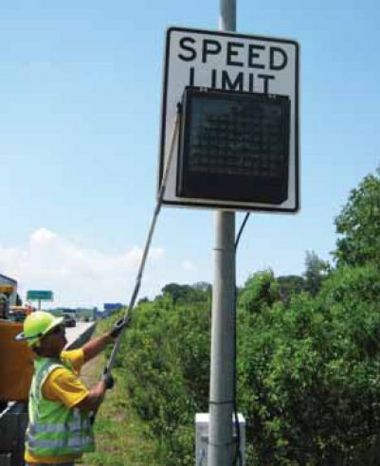 Alton Thomas, St. Louis District Maintenance Crew Leader, changes the I-270 variable speed limit signs to be advisory speeds.