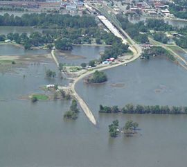 Work on the Ameilia Earhart Memorial Bridge continues even while the Missouri River remains well above flood stage. In the photo on the left, Atchison, KS is in the background.