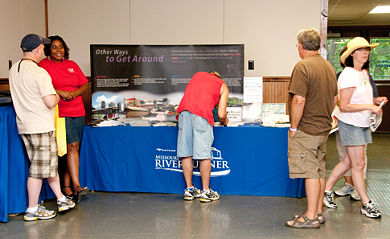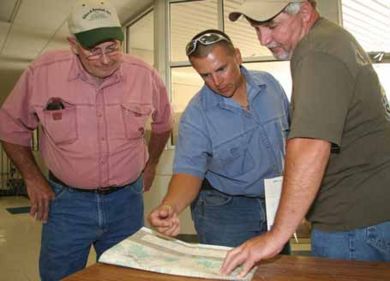Dusty Sears, Sr. Construction Technician, center, discusses a detour route during a Bradleyville public meeting before the Rte. 76 Beaver Creek bridge was closed. A new Safe & Sound bridge will be opened in October.