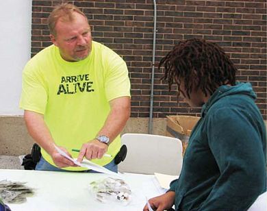 Ken Cherry, Regional Maintenance Supervisor in North St. Louis County, discusses the dangers of impaired driving with a safety fair visitor.