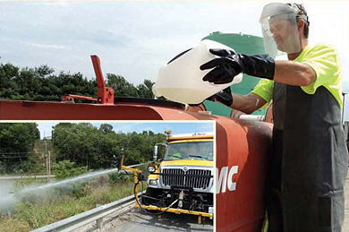 Cassville Sr. Maintenance Worker Clay Vaught mixes herbicide chemicals. Vaught and Cassville Sr. Maintenance Worker Jesse Durossette, behind the wheel, spray a Rte. 76 roadside near Cassville.