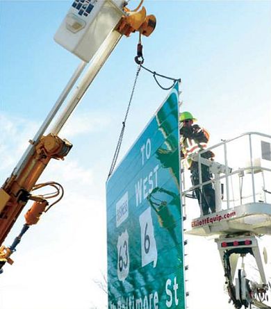 Don Trivette, Sr. Maintenance Worker, and others crew members install new signs at both ends of the new US 63 near Kirksville.