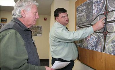 Transportation Project Manager Sean Matlock, right, explains the project to rebuild the I-44/Range Line Road interchange in Joplin during a public meeting at the Joplin Regional Office.