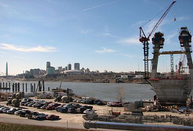 Viewed from Illinois, the two Mississippi River Bridge towers reach half of their eventual 400 ft. height. After completing the towers in late spring, crews will start placing the cables and the framework for the driving surface. The entire project, including several new interchanges, is on track to be complete in early 2014. Live cameras of the project are available for viewing.