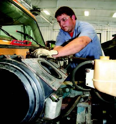 Intermediate Equipment Technician Mark Gott removes engine components in a dump truck engine overhaul at the SW District garage.