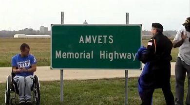 Veterans unveil the new highway sign designating Rte. 94 in Callaway County as AMVETS Memorial Highway. The designation honoring American veterans runs from the intersection of U.S. 54 to one mile east of Rte. D near Portland.