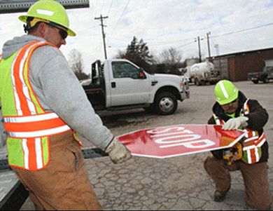 Maintenance Worker Joe Gundel, left, and Sr. Maintenance Worker Richard Munoz install a new stop sign at Rte. 112 and County Road 2192 near Cassville.