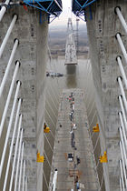 The roadway will meet in the middle of the river in late June or July. Workers are closing the gap between the two towers by about 160 ft. per month and putting up one 40 ft. section of driving surface on each side of the towers about every 10 days.