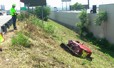 Maintenance Crew Leader Don Sparks operates a remote-controlled extreme terrain lawnmower, dubbed “MoDOT Prowler”, along a St. Louis interstate. The mower's low center of gravity and tire tracks allow it to perform on slopes up to 50°.