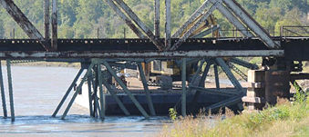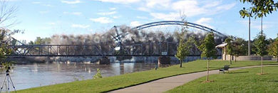 Above, the charges ignite on the old bridge. (A railroad bridge can be seen in front of the old bridge and the new span can be seen behind the old bridge.) Below, the center span falls westward.