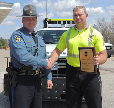 MSHP Lieutenant Steve Ferrier (left) presents Motorist Assist Operator Larry McFadden with a certificate of appreciation in St. Louis. Back in October, minutes after arriving on the scene to assist a stranded motorist, McFadden took immediate action to ensure a wounded motorist did not receive further injuries.
