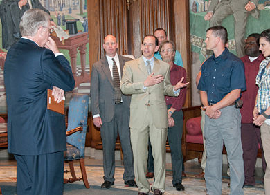 Sr. Maintc. Worker David Winship (right, foreground) was salting roads in SW Clay County in December when he spotted smoke rising from a ravine. He jumped out, ran closer, heard a woman screaming and noticed her vehicle was on its side, filling with smoke. Winship used a pocket knife to cut the convertible top open and he, with another driver, pulled the woman to safety. Chief Engr. Ed Hassinger introduces Winship to Gov. Nixon just prior to the governor awarding him a commemorative plaque for Winship's heroism.