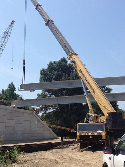 Contractor crews place girders for the Rte. 53/62 bridge at Campbell. The 78-year-old bridge which crosses the Union Pacific Railroad, was closed after excessive movement was noted during a routine inspection.