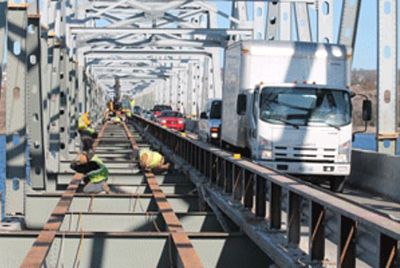 Phillips Hardy employees remove the old deck from the Rte. 13 bridge over Table Rock Lake at Kimberling City. Traffic is down to one lane while the work is being done. The $10 million project will be completed in May 2016.