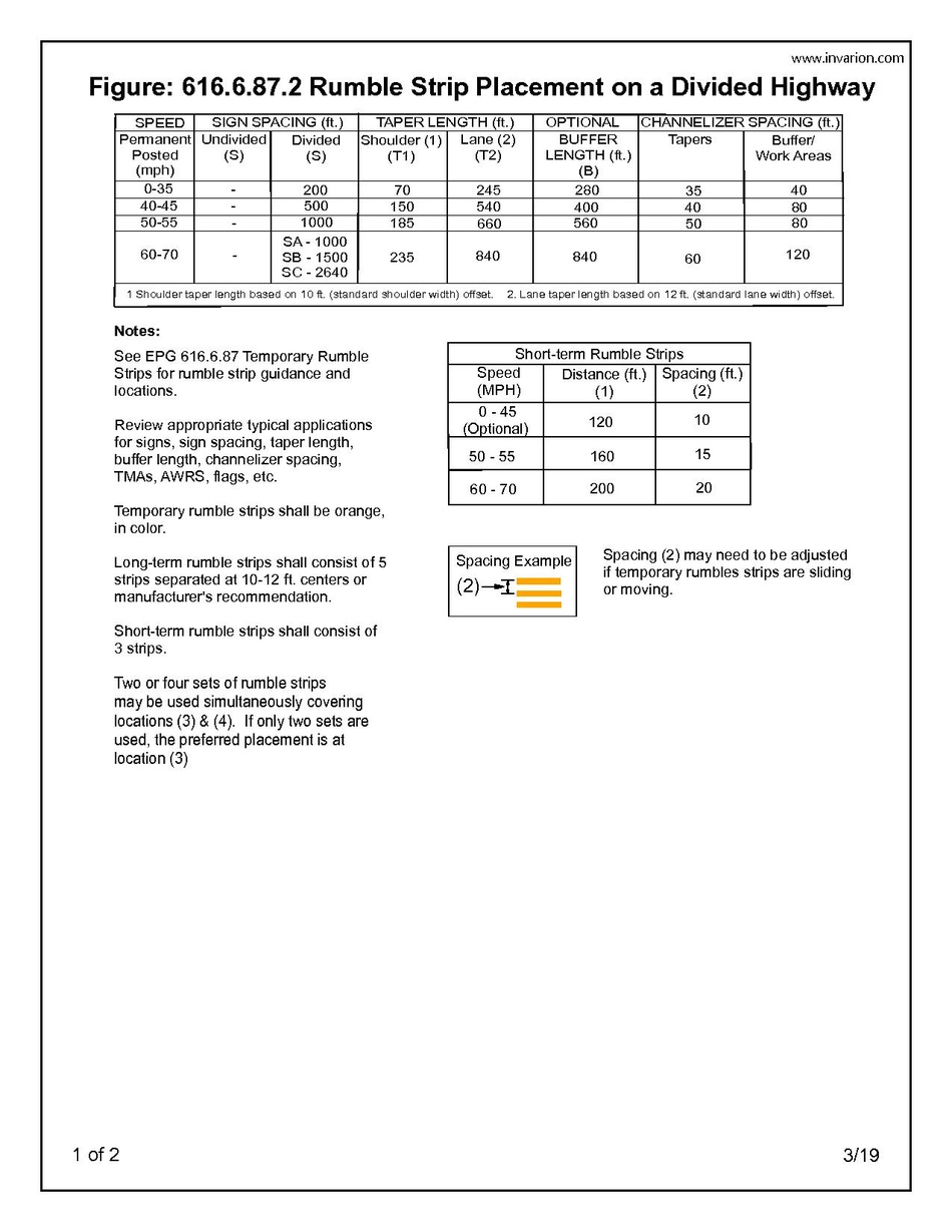 Revision as of 10:01, 4 April 2019 by Smithk (talk | contribs) (616.6.87 Temporary Rumble Strips (MUTCD 6F.87): Per TS, increased the spacing between the long-term rumble strips from "2 to 4 feet" to "10 to 12 feet" in Figs. 616.6.87.1 and .2 for a greater area of effectiveness.)